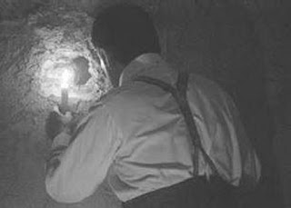 Pour Carter, c'était l'instant de vérité. Comme Carnarvon regardait par-dessus son épaule d'un air interrogateur, il frappa la porte à grand coups jusqu'à ce qu'il y ait percé un trou assez grand pour y introduire une bougie et jeter un coup d'oeil.