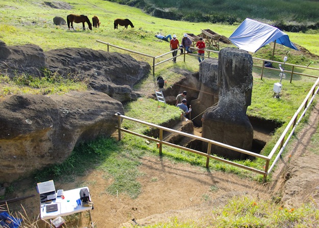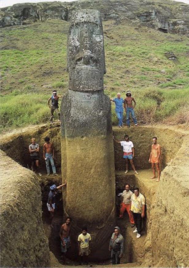 Si on attribue au couple Routledge la découverte des parties enterrées des statues de l’ile de Pâques, un groupe privé de recherches a récemment excavé une des statues pour y découvrir de nombreuses écritures sur le corps.