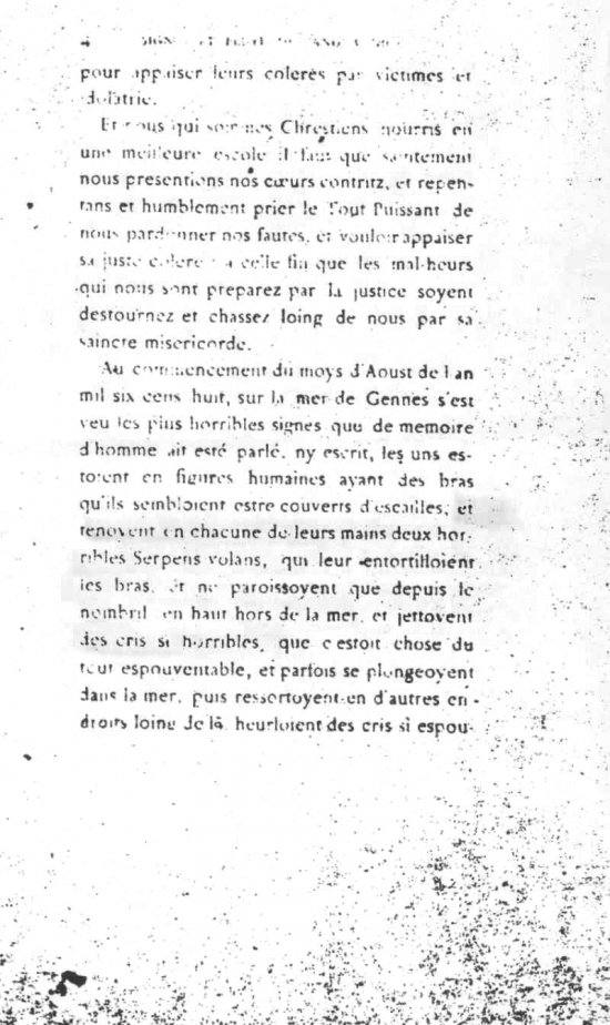 Au commencement du mois d'août de l'an 1608, sur la mer de Gênes, ont été vus les signes les plus horribles dont ont ait parlé ou écrit de mémoire d'homme. Les uns ressemblaient avait l'apparence humaines avec des bras semblant couverts d'écailles et tenant dans chacune de leur main 2 horribles serpents volants, qui leur entortillaient les bras, et ne paraissant que depuis le nombril, en haut hors de la mer et jettant des cris si horribles qu'il s'agissait de la chose la plus épouvantable, et plongeant parfois dans la mer, puis ressortant en d'autres endroits loin de là, hurlant des cris si épouvantables que plusieurs ont été malades de la peur qu'ils ont eu. Ils en voyaient qui ressemblaient à des femmes ; d'autres avaient des corps d'apparence humaine, couverts d'écailles, mais dont la tête était comme celle d'un dragon.